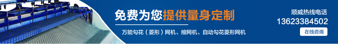 安平縣順威絲網機械設備制造有限公司自產自銷,省去中間環節,讓利給客戶,真正的讓您省錢。主要產品有:萬能勾花(菱形)網機、縮網機、自動勾花菱形網機、全自動勾花菱形網機。